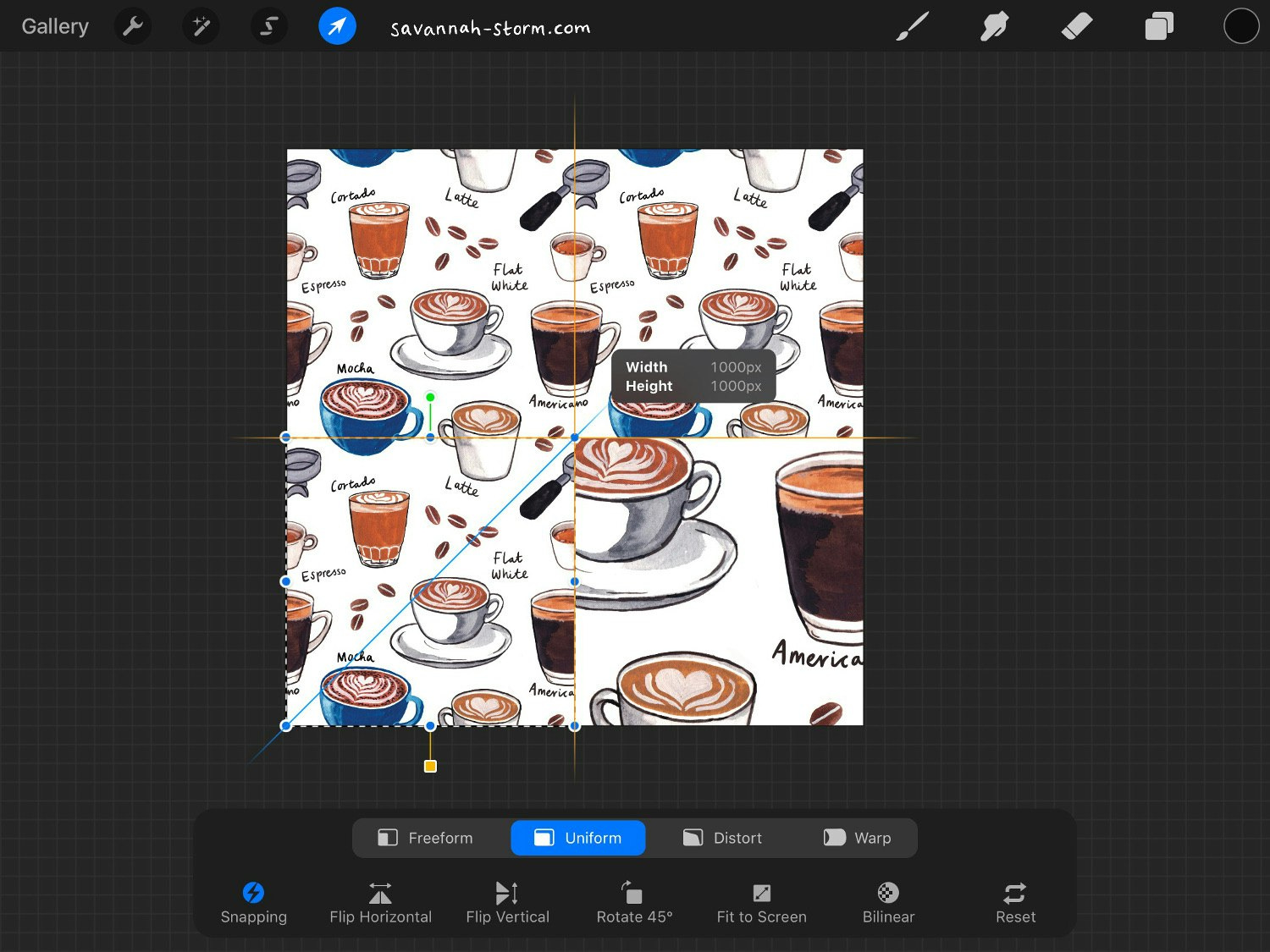 Step 10 - To test your repeating tile, make 4 copies again in the same way we did before - Copy Canvas, Paste makes a new layer, duplicate the layer 4 times. This time though, making sure 'Uniform' is selected at the bottom menu on Transformation mode, shrink each layer to half the size (my canvas is 2000px square, so 1000px for me) and as you do this again the snapping should put them in the correct place.